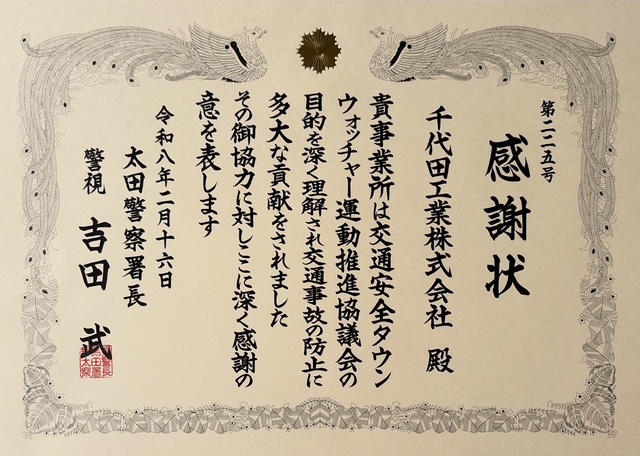 交通安全活動に対する感謝状をいただきました